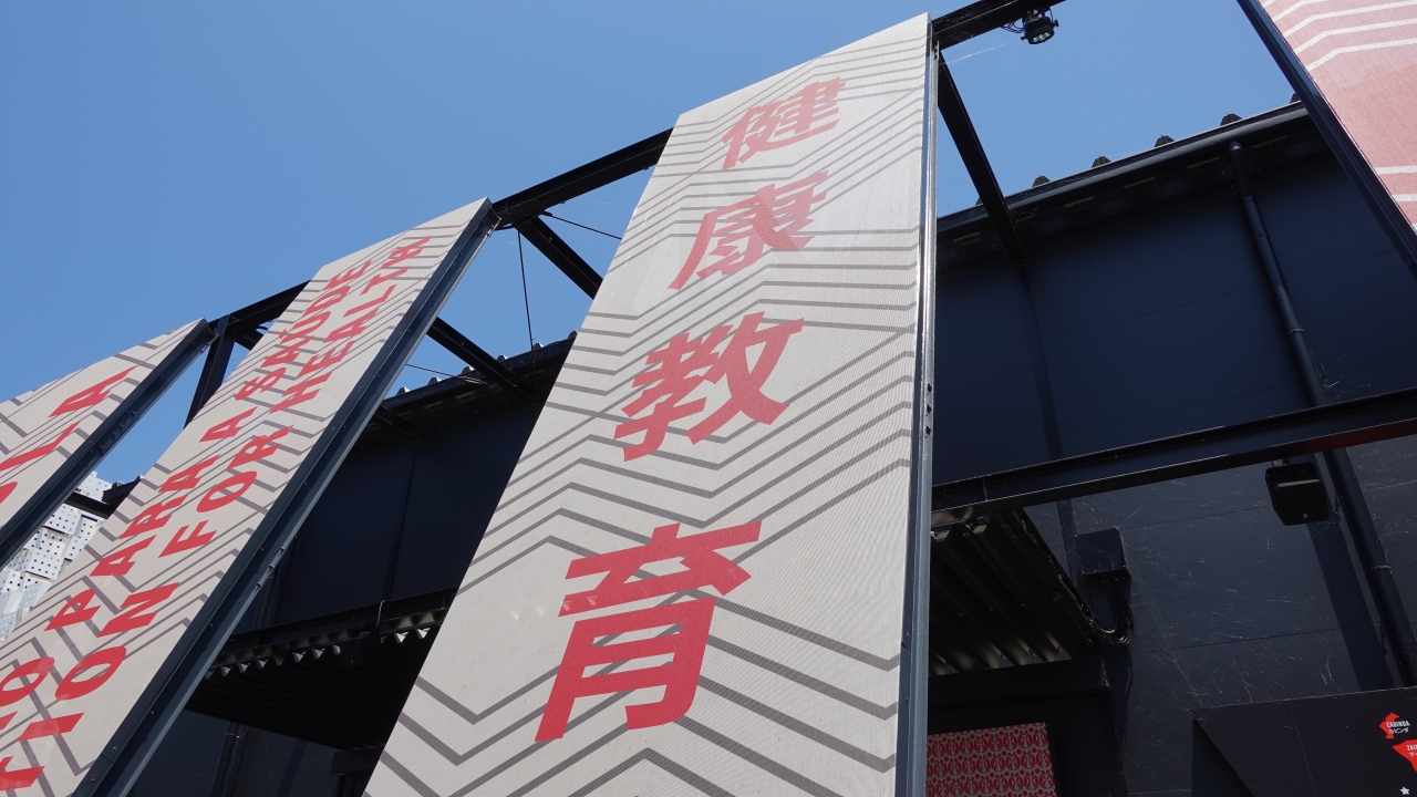 [S23]アンゴラパビリオンに掲げられたテーマ「健康教育」